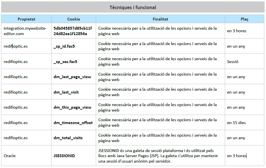 - Cookies tècniques i funcionals: són les que permeten a l’usuari navegar a través d’una pàgina web, plataforma o aplicació i utilitzar les diferents opcions o serveis que hi hagi.